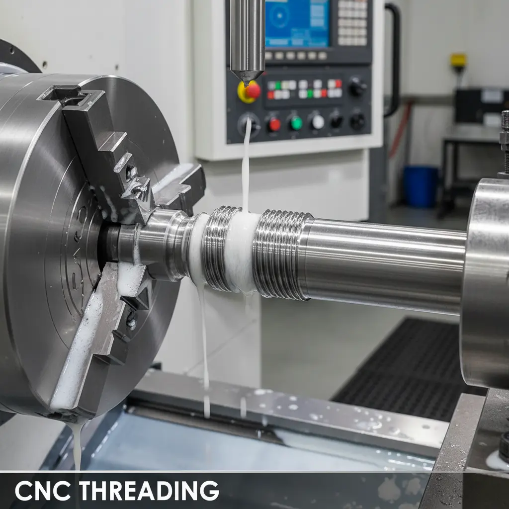 In our CNC threading process, we use our computer-controlled machine equipped with tools to cut internal or external threads on a workpiece with high precision and consistency.